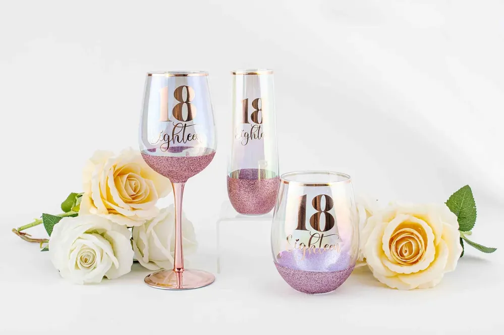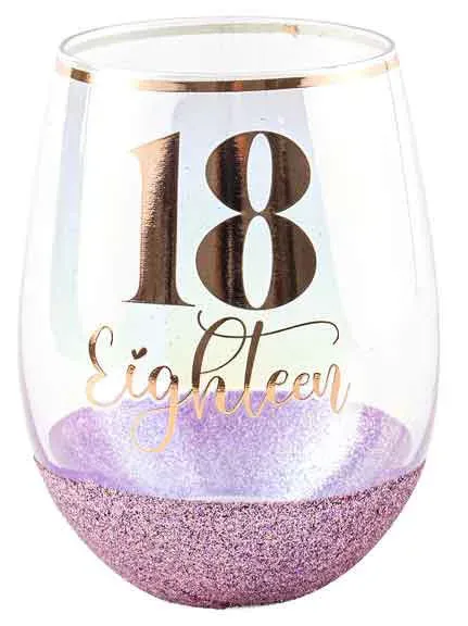Add some sparkle to 18th celebrations with this eye-catching Glitter Stemless Glass. Featuring a glittering purple base and bold 18th design, this fun stemless glass is perfect for birthday drinks and celebrations.