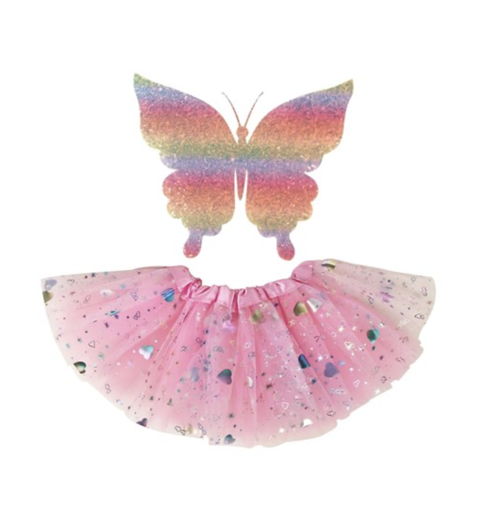 • Colour / Design: Pastel pink tutu with hearts and sparkles; rainbow glitter butterfly wings