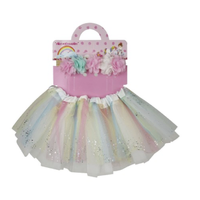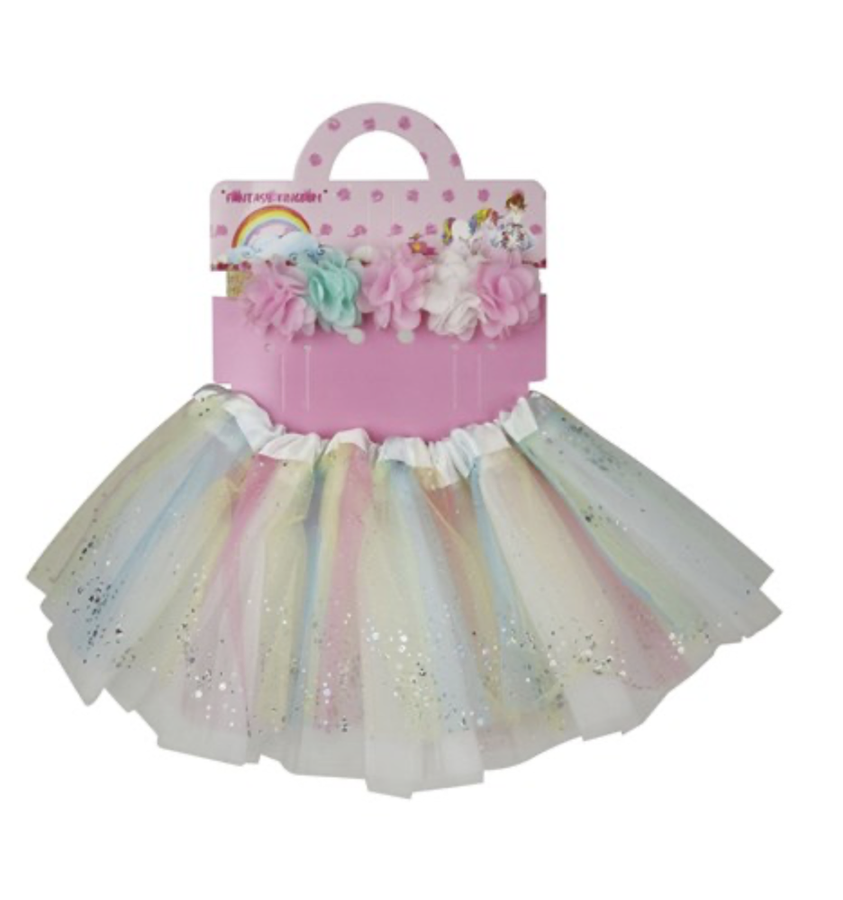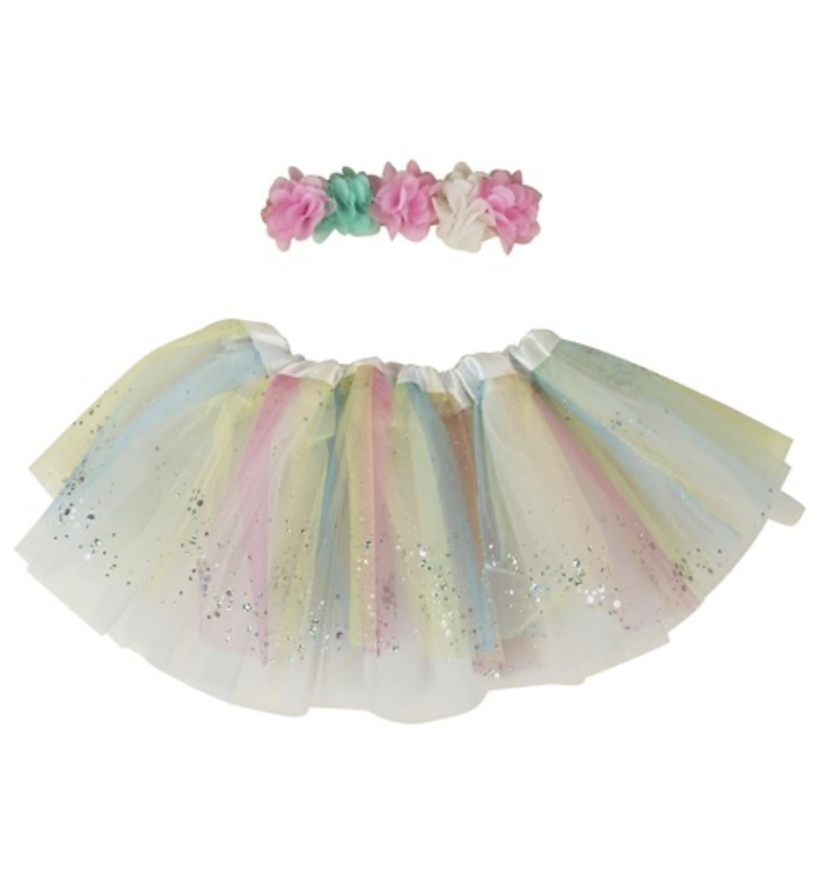 • Includes: Pastel rainbow tulle tutu; floral elastic headband