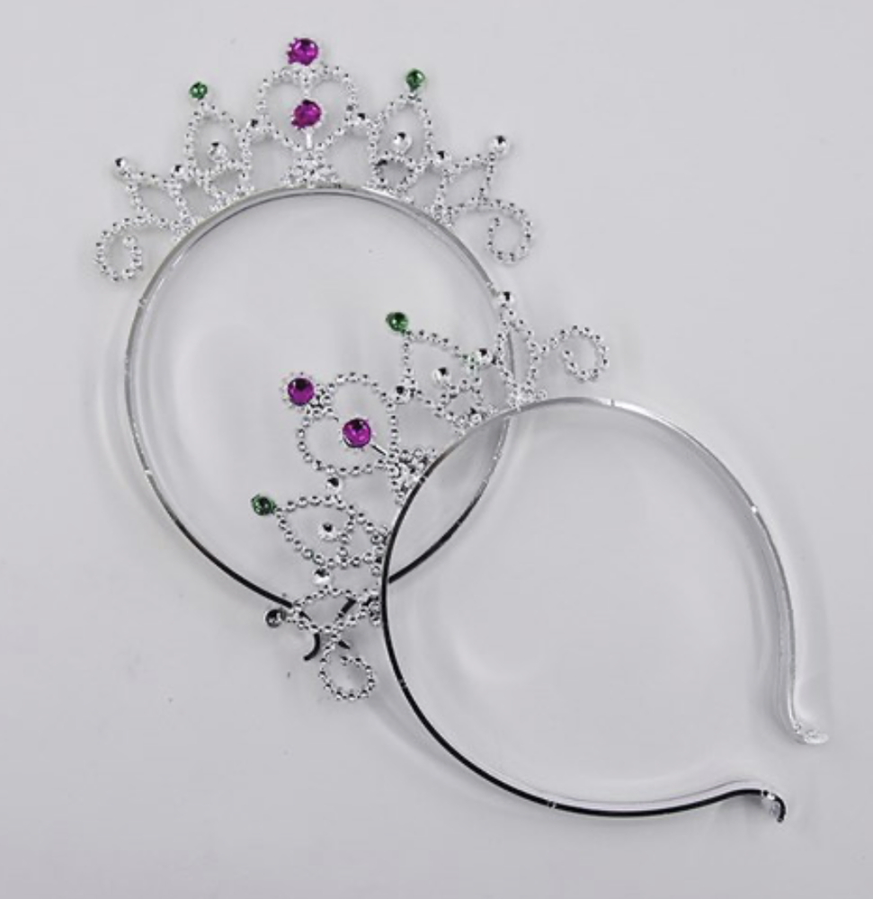 • Colour / Design: Silver finish tiaras with purple and green gems