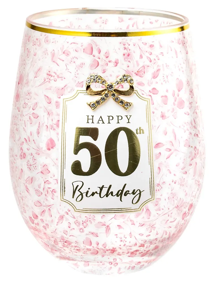 Celebrate a milestone 50th birthday in style with this elegant Stemless Pretty Bow Wine Glass. Featuring a beautiful Pretty Bow motif with a 50th Birthday design and metallic foil accents, this modern stemless glass is perfect for wine, champagne, or any favourite drink.