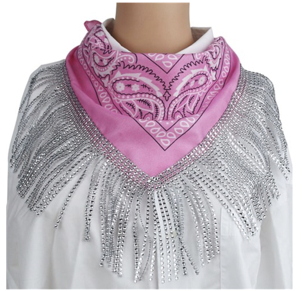 • Includes: One pink paisley bandana with attached silver rhinestone fringe
