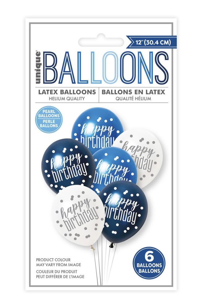 • Includes: 6 x 30cm latex balloons (pearlescent navy, royal blue & white) printed with "happy birthday" and confetti dots