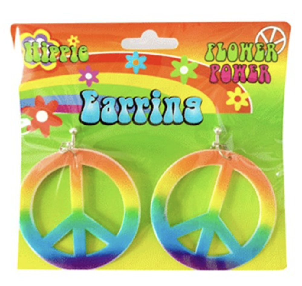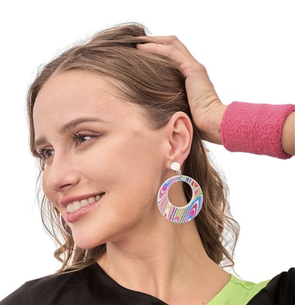 Turn heads with these oversized 60s Mod Earrings — colourful psychedelic hoops that add instant vintage flair to any outfit. This one-size pair hangs from a small stud for a bold, jaw-length drop that's perfect for 60s-themed parties, retro nights or fancy dress. Eye-catching enough to be the focus of your look. Available for pickup in Perth if you need it quickly.