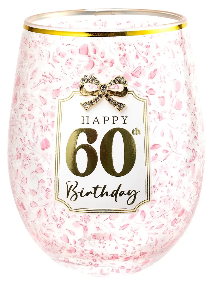60th Birthday Stemless Pretty Bow Wine Glass - Gift Boxed
