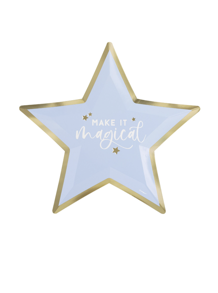 Turn any kids’ party into a little bit of magic with these star-shaped plates. Pale blue with a shiny gold rim and a cheerful "Make It Magical" script, they’ll lift your party table in an instant. Supplied as a pack of 8, one size fits the usual party spread — perfect for unicorn-themed birthdays, baby showers and dress-up afternoons.
