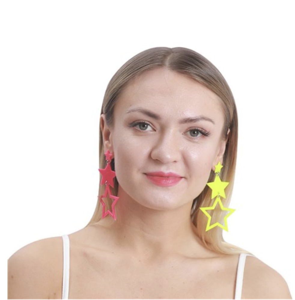 • Colour / Design: Oversized double-star drops in neon pink and neon yellow