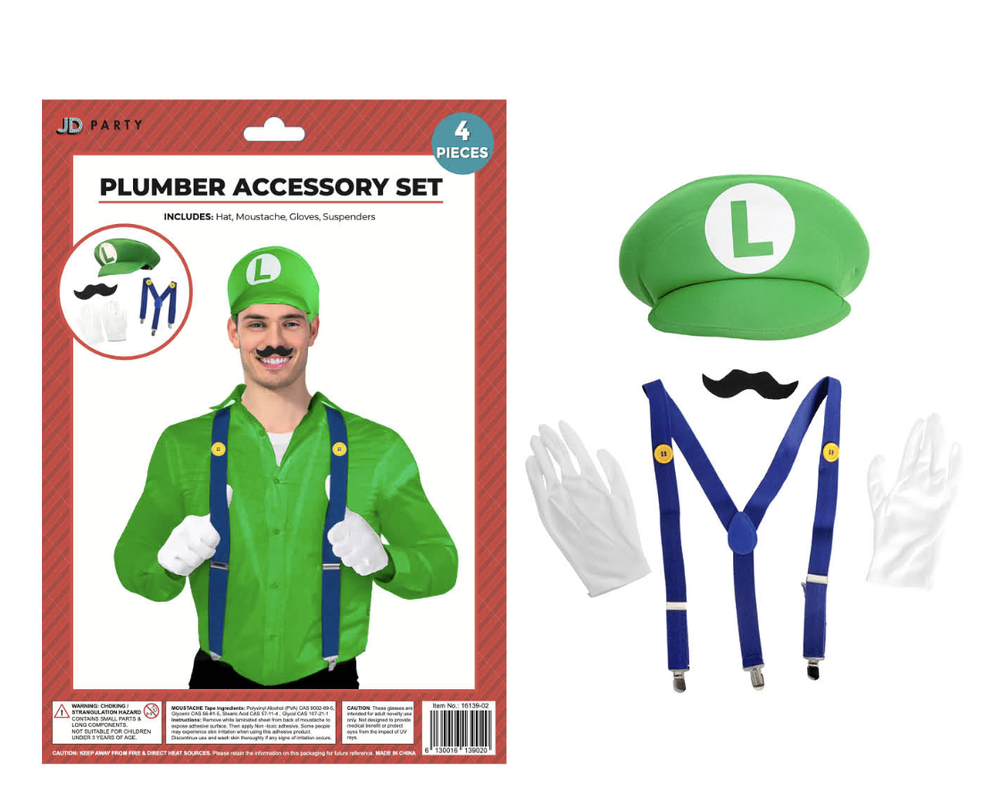 Finish off a plumber-style costume with this easy 4-piece accessory set that turns heads at Halloween, cosplay nights or any fancy-dress do. The kit is one size — One size fits most adults — and includes all the small touches that pull a look together: a bright green peaked cap with a white “L” badge, blue clip-on suspenders, white gloves and a stick-on moustache. Ready for pickup in Perth.