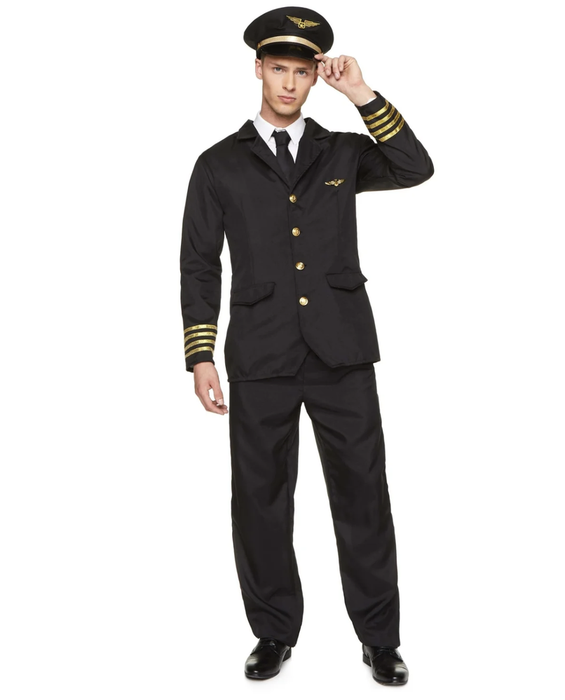 • Key Feature: Captain-style cuff stripes and peaked cap for an authentic pilot look