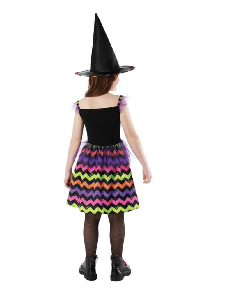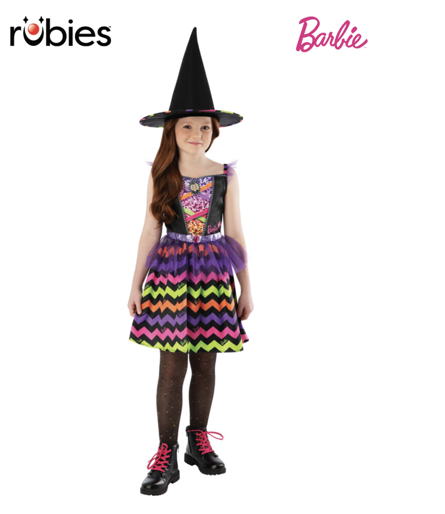 Bright, playful and just the right side of spooky — this Barbie Witch costume turns trick-or-treating into a fashion parade. The toddler-sized tutu dress features a velour bodice, rainbow sequin panel and chevron satin skirt with a purple tulle peplum; a matching tall pointed hat finishes the look. Available in Toddler size and perfect for Halloween — available for quick pickup in Perth.