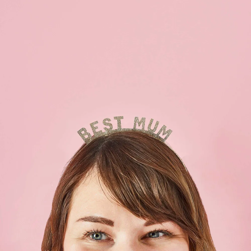 • Includes: Gold glitter headband with "BEST MUM" lettering