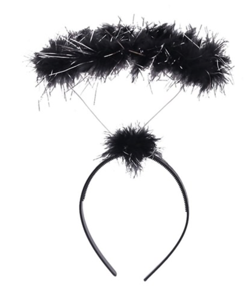 Bring a dark twist to angelic costume ideas with this Black Halo Headband. The one-size headband perches a feather-trimmed halo threaded with silver tinsel on sprung wires for a floating ‘dark angel’ look — perfect for Halloween, themed parties or a gothic dress-up. Lightweight and comfortable for adults, it slips on easily for instant impact.
