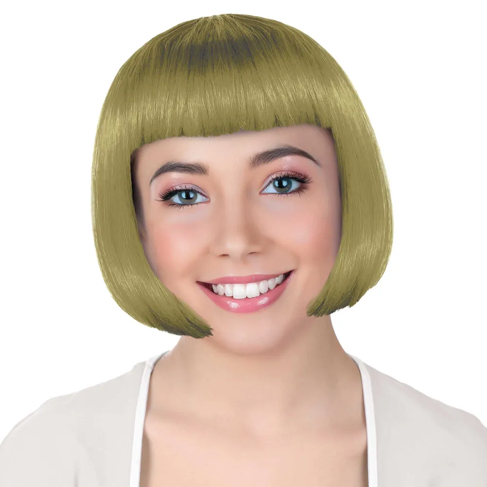 • Colour / Design: Metallic gold, chin‑length bob with blunt fringe
