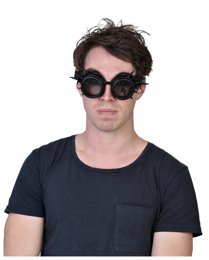 Turn heads at your next steampunk soirée or Halloween party with the Bram Steampunk Goggles — a dramatic, industrial finish that instantly upgrades any inventor, aviator or mad scientist costume. The bold matte‑black frames, pointed side studs and mesh lenses create a gritty Victorian look. One size fits most adults with an adjustable elastic strap for a snug, comfortable fit. Available for pickup in Perth.