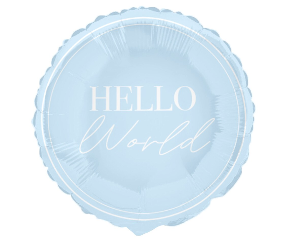 Add a gentle, stylish touch to baby showers and new-baby celebrations with this Hello World 9-inch (23 cm) round foil balloon in soft pale blue, printed with a white "Hello World" script and subtle double-ring border. Sold in bulk packs for parties and events and available for local pickup in Perth/