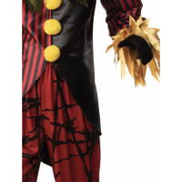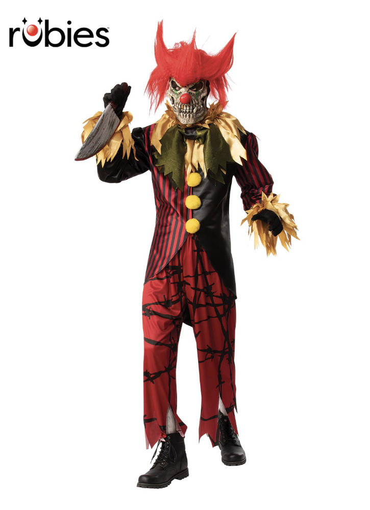 Make a terrifying entrance this Halloween in this XL Crazy Clown costume — a ripped, striped jacket and jagged red trousers printed with barbed-wire detail that grab attention from across the room. The set pictured includes a skull-like clown mask with wild red hair so you’ll be stage-ready without hunting for extras.