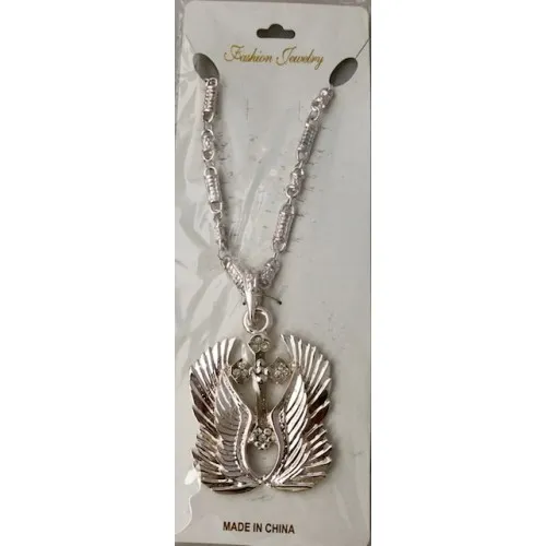 • Colour / Design: Shiny silver finish with sculpted 3D feathered wings and cross