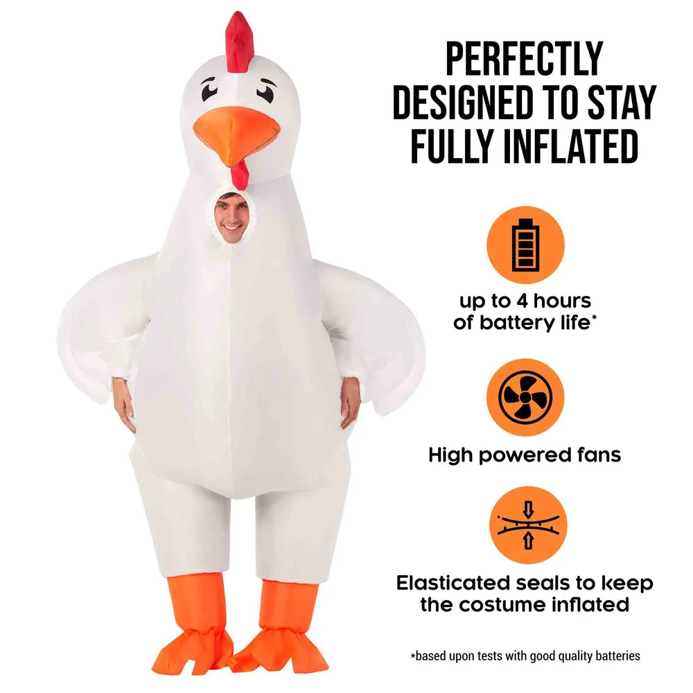 • Includes: Full inflatable chicken suit (one piece)