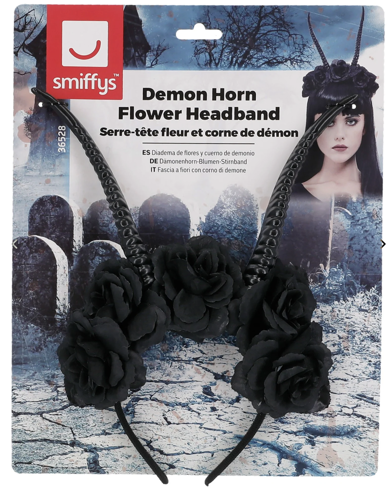 • Material: Plastic horns with fabric flowers on a flexible headband