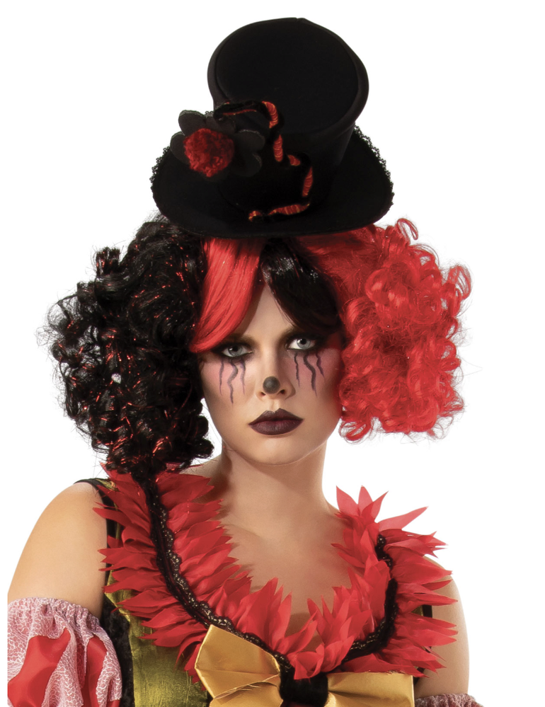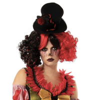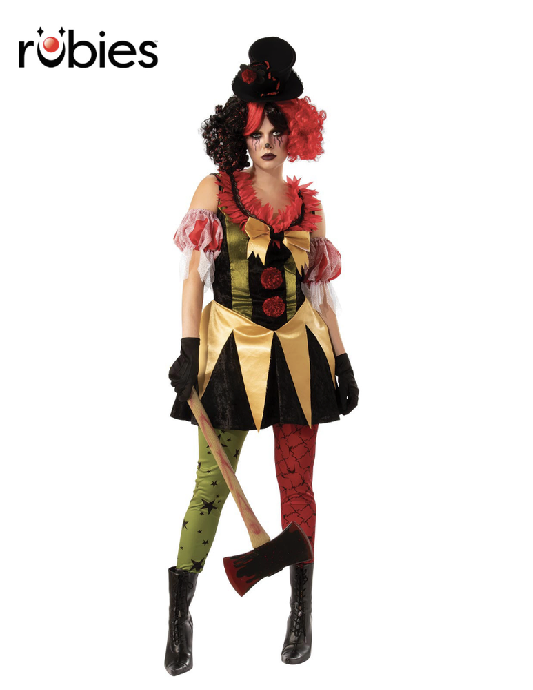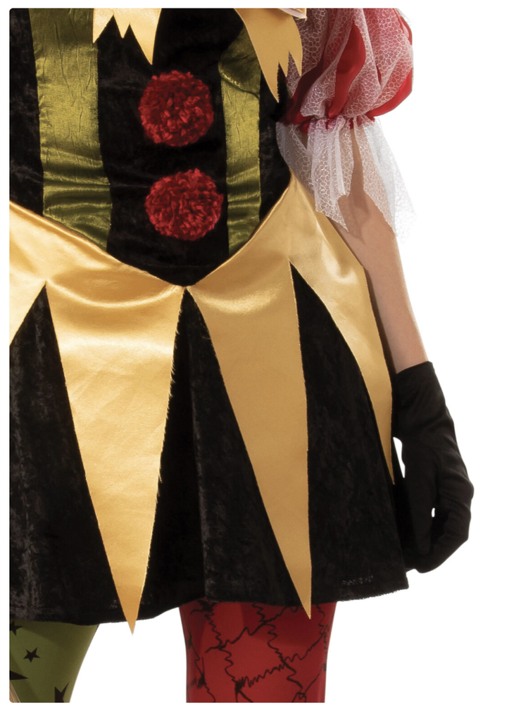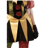 Stand out at Halloween with this sinister, circus-ready Evil Clown Lady costume. The fitted dress mixes ruffled red trim, dramatic gold peak detailing and a pint‑size top hat to create a striking, twisted-jester look that photographs brilliantly. Designed for adults who want scary glamour rather than gore — bold on stage, at parties or haunted-house nights.