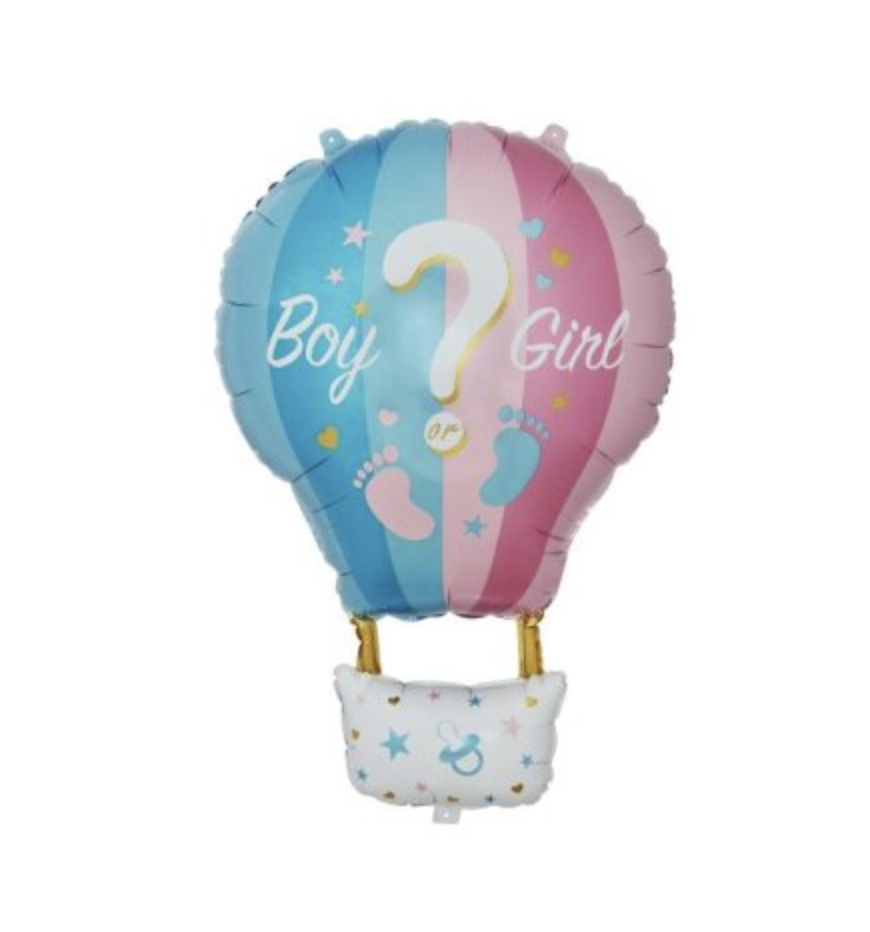 Make your gender-reveal or baby-shower styling pop with this oversized Boy/Girl Hot Air Balloon — a whimsical 80cm shaped foil balloon that splits pink and blue with a giant question mark and baby footprints. One size fits the occasion; inflate with helium or hang as a statement piece. Available online or for pickup in Perth.