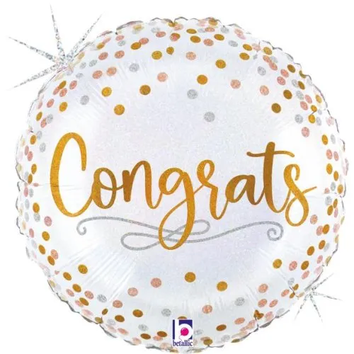 18-inch round holographic foil balloon with "Congrats" text and glittering confetti design. Shimmering iridescent finish to celebrate achievements in style.