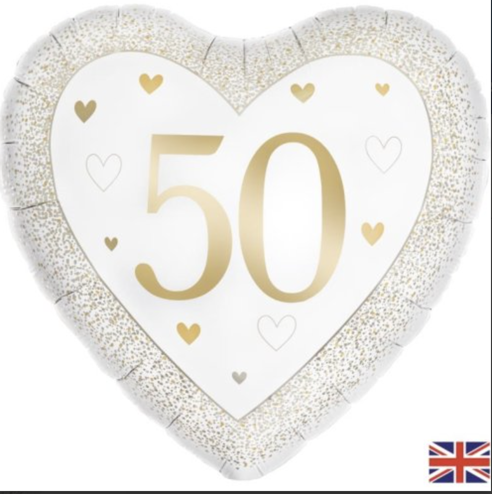 Celebrate a golden milestone with this heart-shaped foil balloon printed with a large gold '50' that instantly lifts the mood at any party; the white background and scattered gold hearts give a modern, celebratory look while the shaped silhouette adds romantic charm. It works as a standalone feature or paired with bouquets and banners, creating an eye-catching photo backdrop, table centre or gift display that suits both intimate and larger gatherings, and it complements metallic streamers, number balloons and floral arrangements for a cohesive golden theme.