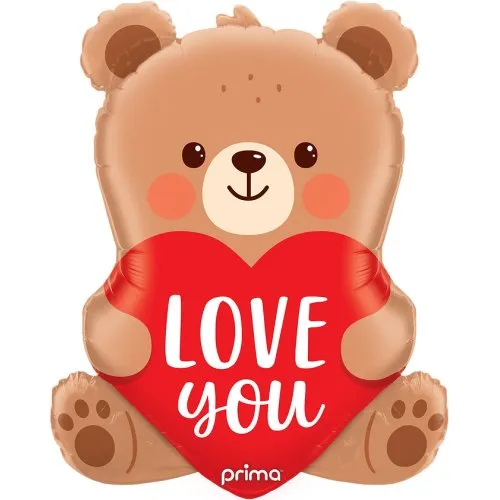 27-inch shaped foil balloon of a cute teddy bear holding a red heart reading "Love You." Adorable design for Valentine's Day, anniversaries, and romantic gestures.