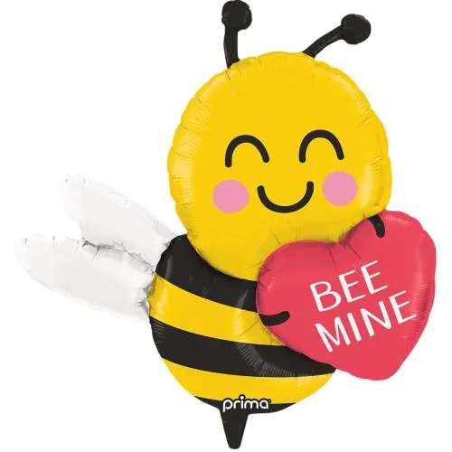 32-inch shaped foil balloon of a cute smiling bumblebee holding a red heart reading "Bee Mine." Fun and playful for Valentine's Day and love-themed party decorations.