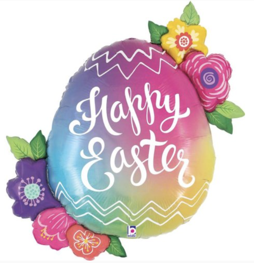 Add a burst of springtime colour to your Easter celebration with this oversized pastel ombré egg foil balloon, complete with flowing white "Happy Easter" script and layered floral accents that frame the design; its soft rainbow hues and sculpted flower details instantly brighten tables, doorways, mantelpieces and photo backdrops.