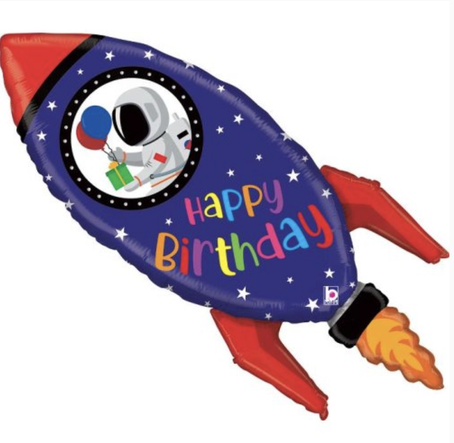 40-inch rocket-shaped foil balloon with birthday design. Blast off into birthday fun — perfect for astronaut, space, and rocket-themed party celebrations.