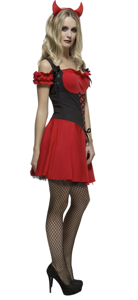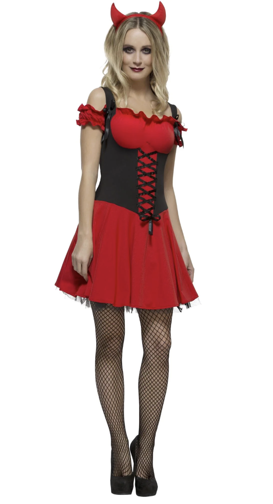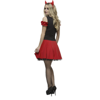 Own the room this Halloween in the Wicked Devil Costume — a flirty red-and-black mini with ruffled off-shoulder sleeves, a corset-style lace-up front and a full skater skirt with a peek of tulle. It's the easy go-to for parties or trick-or-treat nights when you want to be playful with a wicked twist.