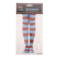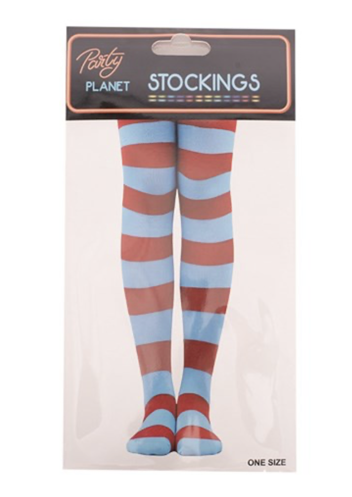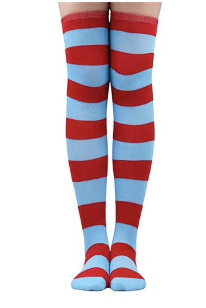 Add instant mischief to a Thing 1 & Thing 2 look or liven up Book Week and Halloween with these bold striped thigh‑highs. The wide alternating red and sky‑blue bands pop under skirts, tutus or shorts so you’ll stand out in a crowd. One size fits most adults thanks to a stretchy fit—easy to slip on for parties or dress‑ups.