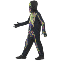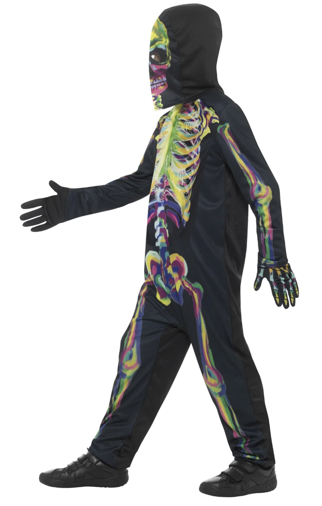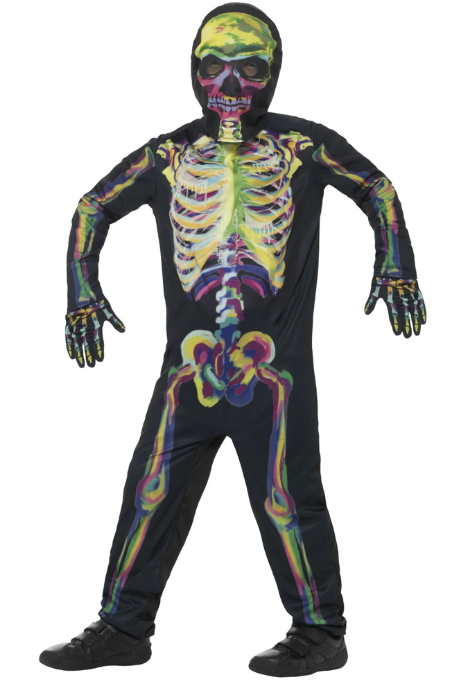 Turn heads this Halloween with a neon twist on a classic: a multi‑coloured glow‑in‑the‑dark skeleton jumpsuit that pops under blacklight and in low light. The one‑piece, hooded suit wraps the wearer in vivid ribs, pelvis and limb prints so they'll be seen from across the party. Pickup in Perth available.