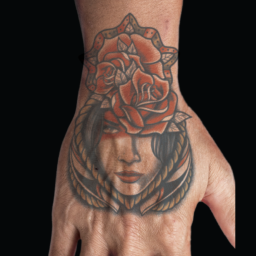 • Colour / Design: Red roses with dark-lined portrait for full-hand coverage