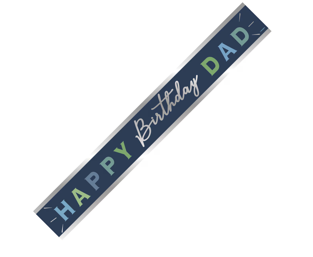 • Colour / Design: Navy background with silver trim; mix of block and script lettering in green and light blue reading "HAPPY Birthday DAD"