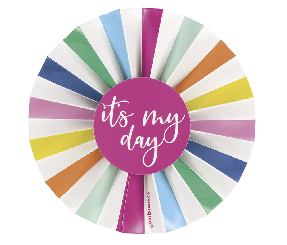 Declare the birthday VIP with this colourful "It's My Day" rosette badge — a bright, pleated ribbon pin that makes the celebrant easy to spot in photos and at parties. One size fits most and it's sold as a single rosette. Lightweight and simple to attach, it’s the perfect finishing touch for kids' birthday celebrations.