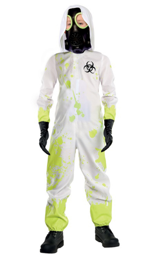 Ensure your Halloween is both fun and frightfully safe with this Kids HazMat Suit Costume. Perfect for spooky season, this white hooded jumpsuit features nuclear green splatters and a striking black biohazard symbol on the chest. Designed to make your child stand out, this costume comes in a range of sizes, complete with black rubber gloves and a gas mask for a realistic touch.