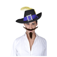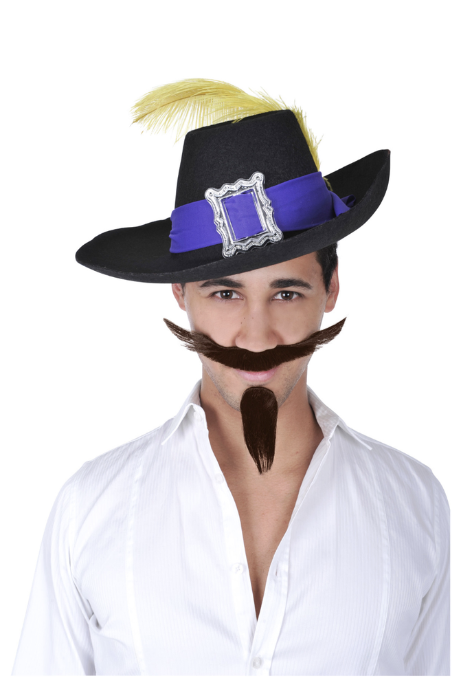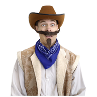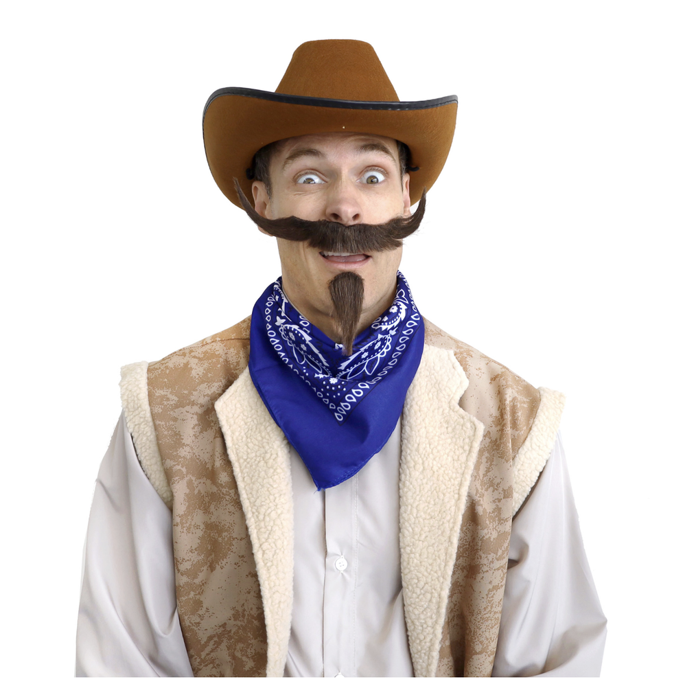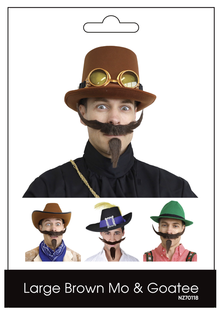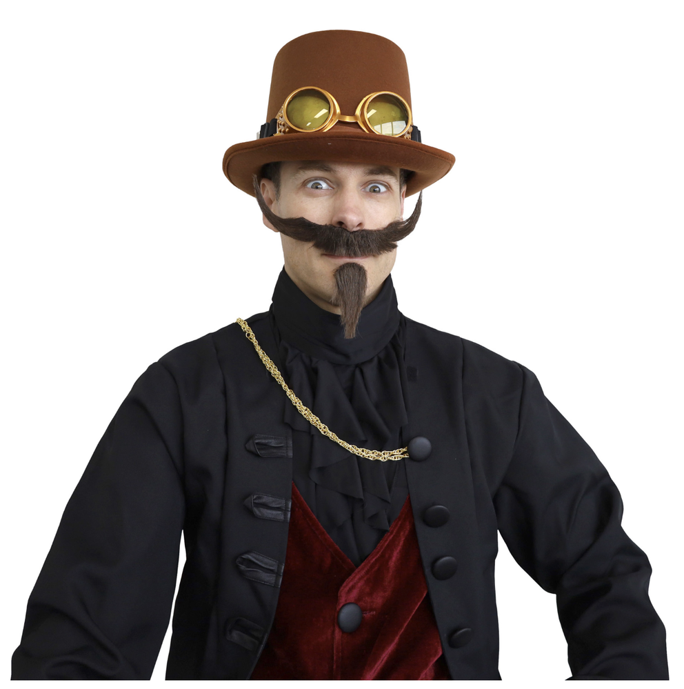 Turn heads at your next fancy dress or steampunk night with this Victorian Moustache & Goatee. The oversized brown moustache curls theatrically at the ends, paired with a tapered goatee to add instant character for a Victorian gent, cowboy or eccentric inventor. One size fits most adults and works brilliantly for Halloween and themed parties. Hat and costume pictured are not included.