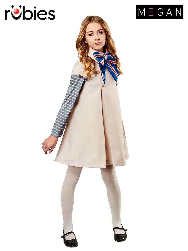 Capture the eerie, screen‑accurate look of M3GAN with this kids’ Size L costume. The beige, pleated dress and striking blue striped bow recreate the uncanny doll silhouette so your child will turn heads at Halloween. This single costume is designed to evoke the film’s iconic outfit in a wearable, child‑friendly cut — perfect for spooky dress‑ups and party nights.