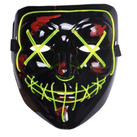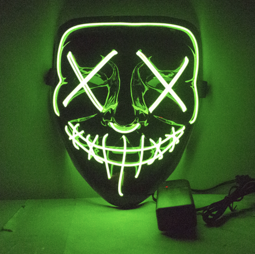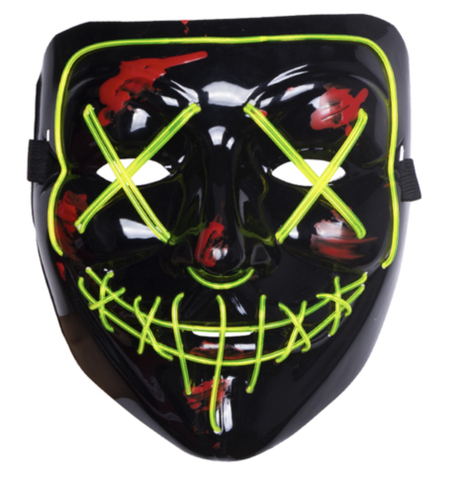 Turn heads at Halloween with this Fluro Green Purge mask — a glossy black face shield traced in glowing EL wire that forms X eyes and a stitched grin. One size fits most adults; the lightweight plastic shell secures with an elastic strap and runs from a small inline battery pack. Perfect for spooky parties, raves or after‑dark events. Ready for pickup in Perth.