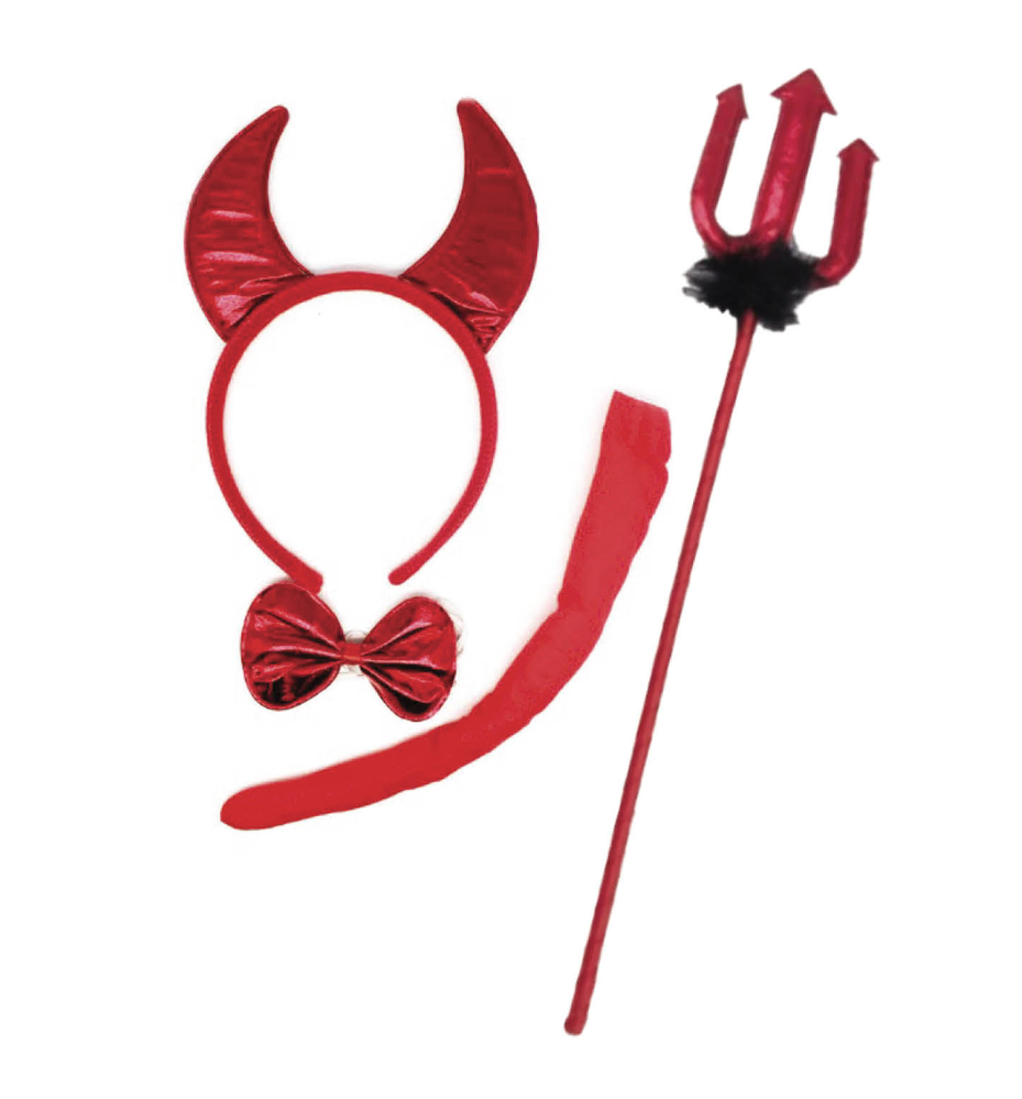 • Includes: Horn headband, bow tie, tail, trident/staff