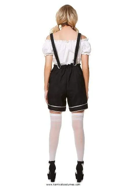 • Includes: Black lederhosen-style playsuit with embroidered suspenders and red lace-up front, white off-shoulder blouse, pair of white knee-high socks with red bows