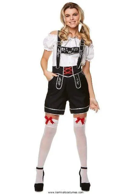 Turn heads at Oktoberfest or any beer‑hall themed event in this cheeky Miss Octoberfest costume. The playsuit-style ensemble pairs black lederhosen shorts and embroidered suspenders with a flirty white off‑shoulder blouse and red lace-up bodice for instant Bavarian charm. Supplied in various sizes, it’s perfect for pub parties, themed nights and festival photos — available for pickup in Perth.