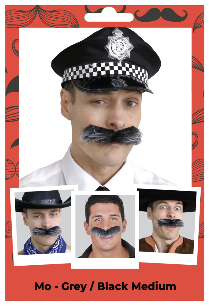 Turn heads and spark laughs with this bushy grey-and-black "Mo" moustache — the perfect finishing touch for cop, cowboy, detective or retro looks. This medium-sized fake moustache delivers a full, natural silhouette over the upper lip for instant character at Halloween or any fancy-dress party. One size: Medium.