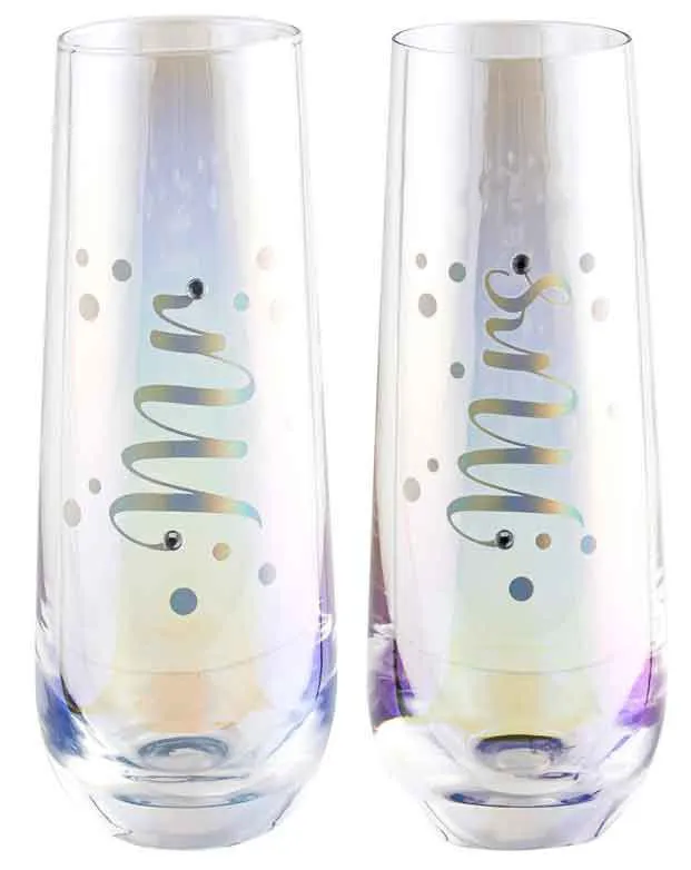 • Includes: Two stemless champagne glasses — one labelled "Mr" and one labelled "Mrs".