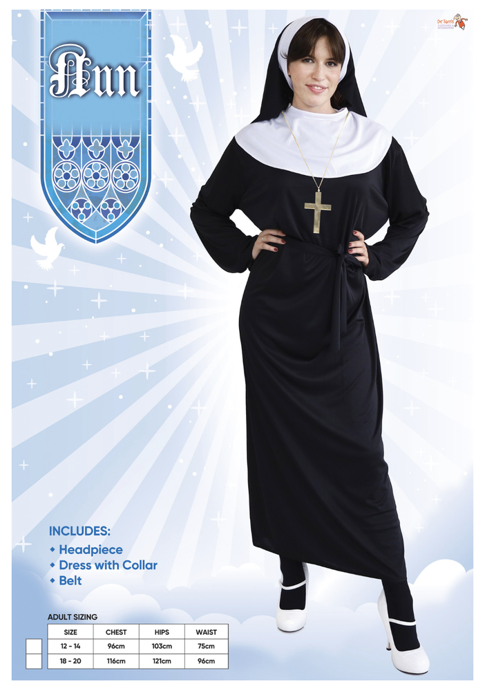 Make a quietly striking entrance in this classic Nun costume — a full‑length black habit with a crisp white wimple and tie belt that flatters Australian adult size 12–14. Ideal for Halloween, stage performances or themed parties, the modest silhouette and easy on‑and‑off design are instantly recognisable. Available for pickup in Perth; size shown is Australian 12–14.