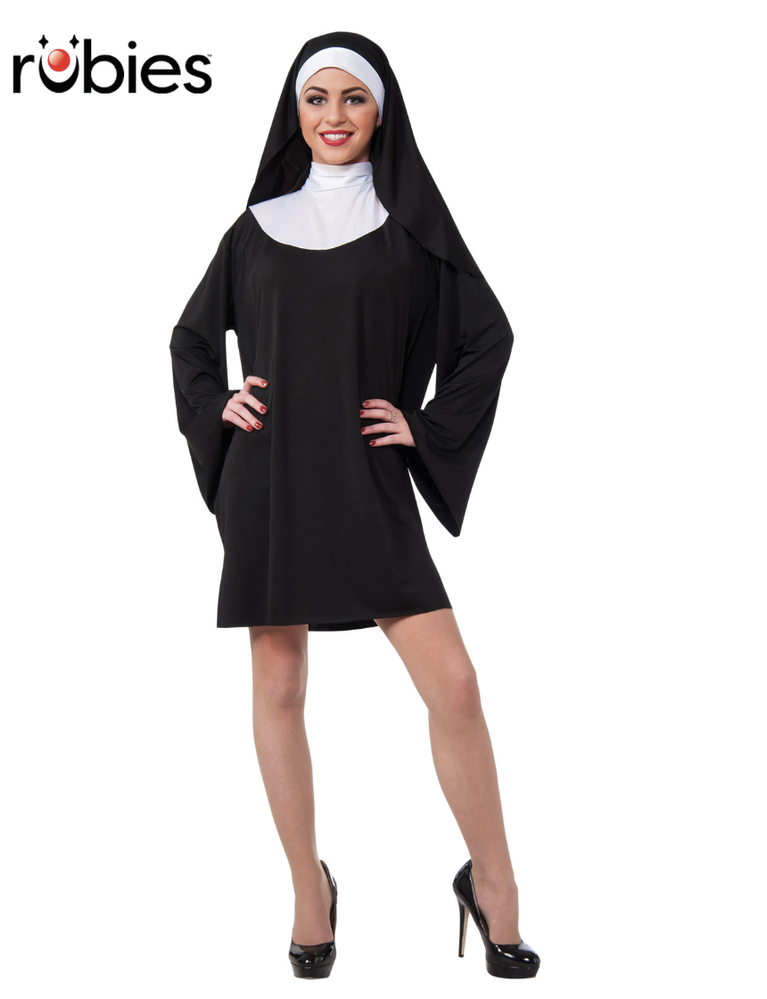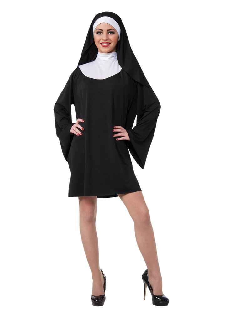 Turn heads at Halloween and themed parties in this cheeky Nun Costume — a modern, flattering take on the classic habit. The loose black tunic falls to mid-thigh with dramatic bell sleeves while the attached white coif and black veil frame your face.