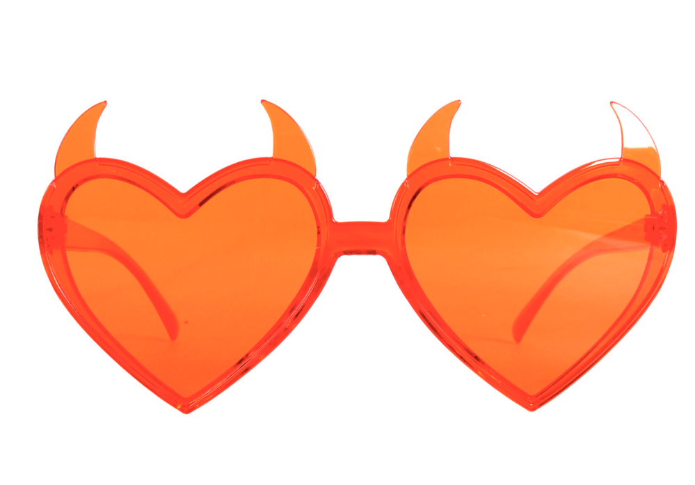 • Includes: Red plastic glasses with heart-shaped lenses and devil horns