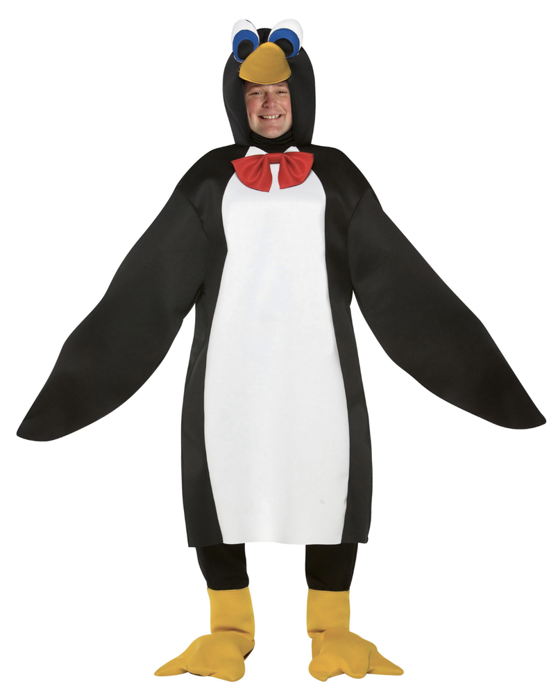 • Includes: Padded tunic with white front panel, hood with oversized eyes and beak, wing sleeves, black leggings, yellow shoe covers, red bow tie